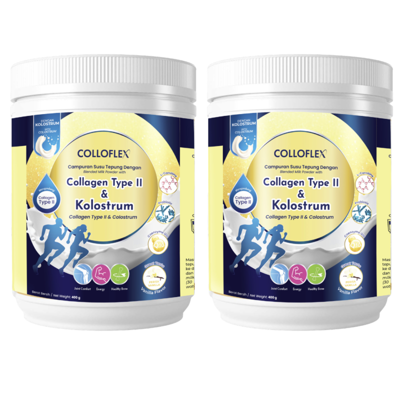 ColloFlex Vanilla 400g 2 Tubs is a once-daily adult milk powder bundle with type II collagen, bovine colostrum, probiotics, prebiotic fibre, L-Carnitine, CoQ10, calcium, magnesium, vitamin D, vitamin C, and B vitamins. Designed for adults and seniors, it supports joint comfort, bone health, digestion, immunity, and everyday energy in one convenient daily drink.