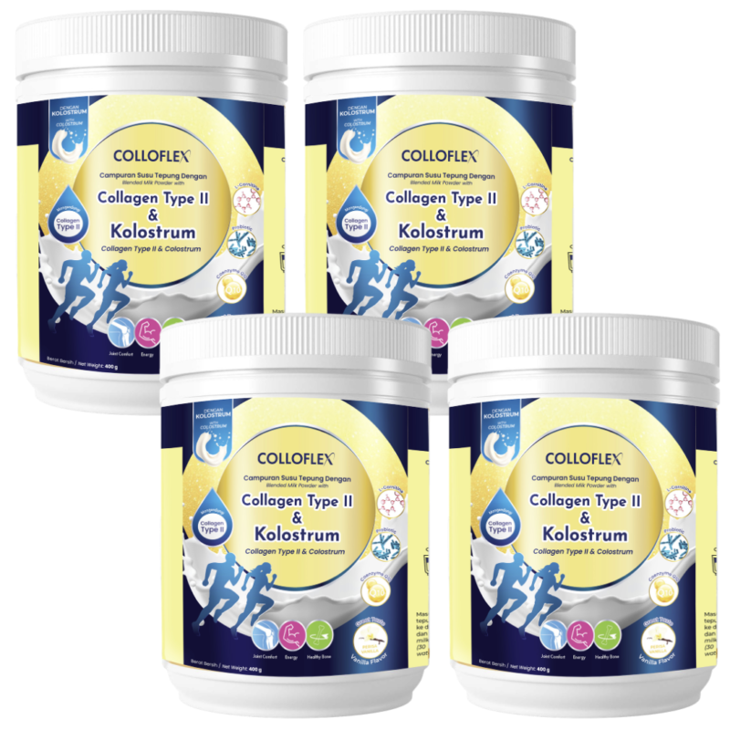 ColloFlex Vanilla 400g 4 Tubs is a once-daily adult milk powder bundle with type II collagen, bovine colostrum, probiotics, prebiotic fibre, L-Carnitine, CoQ10, calcium, magnesium, vitamin D, vitamin C, and B vitamins. Designed for adults and seniors, it supports joint comfort, bone health, digestion, immunity, and everyday energy in one convenient daily drink.