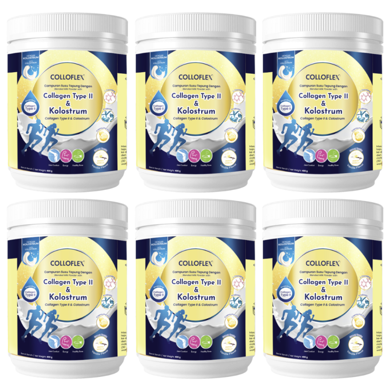 ColloFlex Vanilla 400g 6 Tubs is a once-daily adult milk powder bundle with type II collagen, bovine colostrum, probiotics, prebiotic fibre, L-Carnitine, CoQ10, calcium, magnesium, vitamin D, vitamin C, and B vitamins. Designed for adults and seniors, it supports joint comfort, bone health, digestion, immunity, and everyday energy in one convenient daily drink.