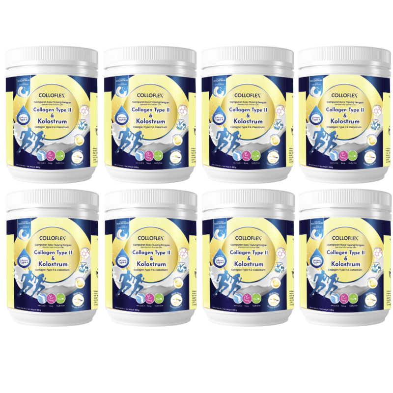 ColloFlex Vanilla 400g 8 Tubs is a once-daily adult milk powder bundle with type II collagen, bovine colostrum, probiotics, prebiotic fibre, L-Carnitine, CoQ10, calcium, magnesium, vitamin D, vitamin C, and B vitamins. Designed for adults and seniors, it supports joint comfort, bone health, digestion, immunity, and everyday energy in one convenient daily drink.